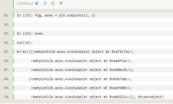 你可以在matplotlib的文档中找到各种图标类型。由于根据特定布局创建Figure和subplot是一件非常常见的任务,于是便出现了一个更为方便的方法(plt.subplots),它可以创建一个新的Figure,并返回一个含有已创建的subplot对象的NumPy数组: