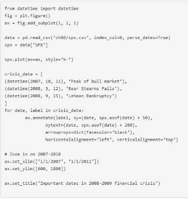 注解中可以既含有文本也含有箭头。例如,我们根据2007年以来的标准普尔500指数收盘价格(来自Yahoo! Finance)绘制一张曲线图,并标出2008年到2009年金融危机期间的一些重要日期。如下所示: