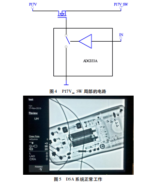 根据实物,施加直流电压到基准及调节板的电源输入,根据板路提示,逐个查看基准及调节板上的电源输出,画出P17V_SW局部的电路图,如图 4。由图 4可见,P17V_SW的电压通过一块模拟开关控制一个场效应管的通断得到。首先静态测量,功率管正常,负载没有短路现象。在相应的测量点焊延长线动态测试,发现模拟开关控制端有逻辑高低电平变化,P17V电压稳定,P17V_SW无电压输出。判断为模拟开关故障,更换后系统正常,如图5。