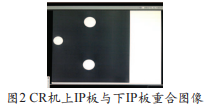 ③因CR机扫描原因,使图像上有白区。运用 “双IP板法”,即在检查台内正常放置一张IP板,在 台面上方与正常方位成90°再放置一张IP板,并在上IP板的上方以三角形放置3枚硬币做标记后曝光。如果故障原因是球管内电子束偏斜,则2个IP板图像上 应有空间重叠的白区,但因上下IP板垂直摆放,故上IP板的白区位置应不在板盒的“胸壁侧”;如果故障是由检查台内部结构引起,则上IP板图像上应无“胸壁侧”白区,下IP板白区应依旧;如果故障原因是由CR机引起的,则上下IP板图像上都应有“胸壁侧” 纵向白区。比较上下IP板图像显示,两个板盒成90°摆放后进行一次曝光,其两幅 图像上的白区所在位置相对于板盒而言是相同的,均在检查台胸壁侧。由此判断,图像上白区的形成与乳腺机无关(如图 2所示)。