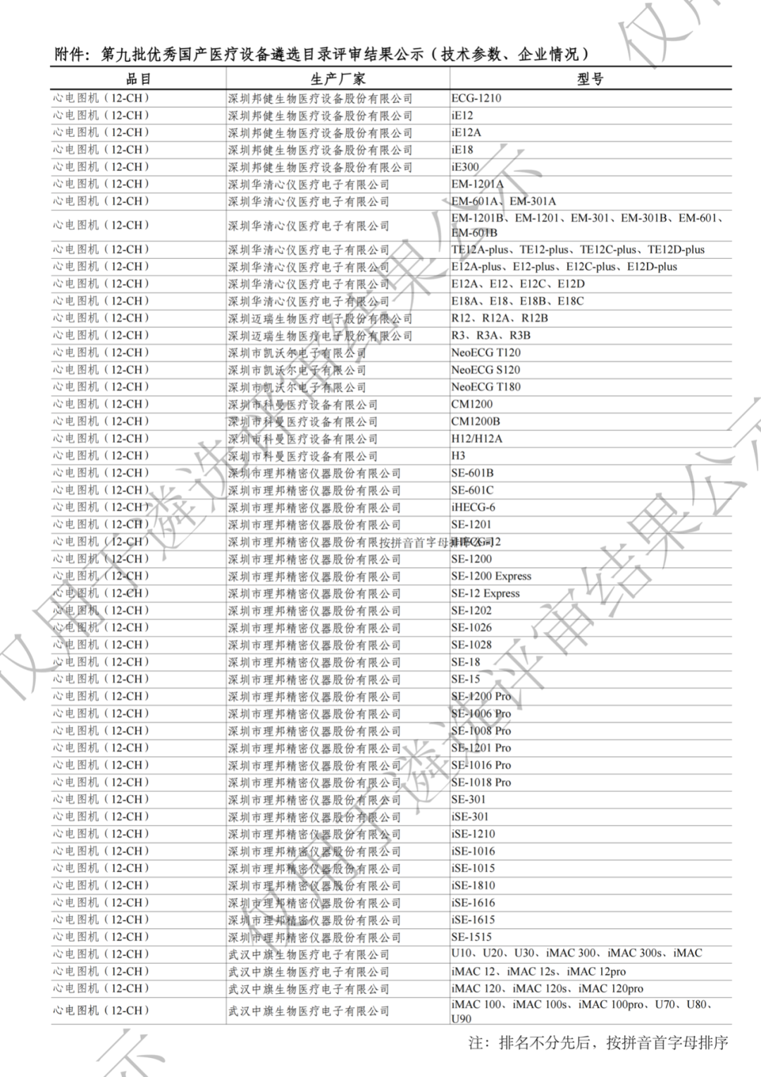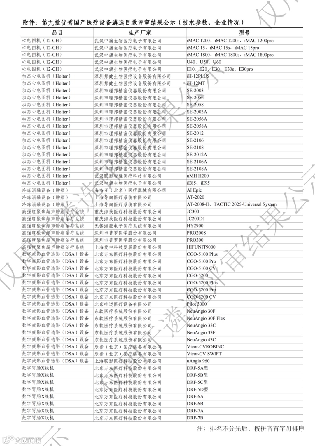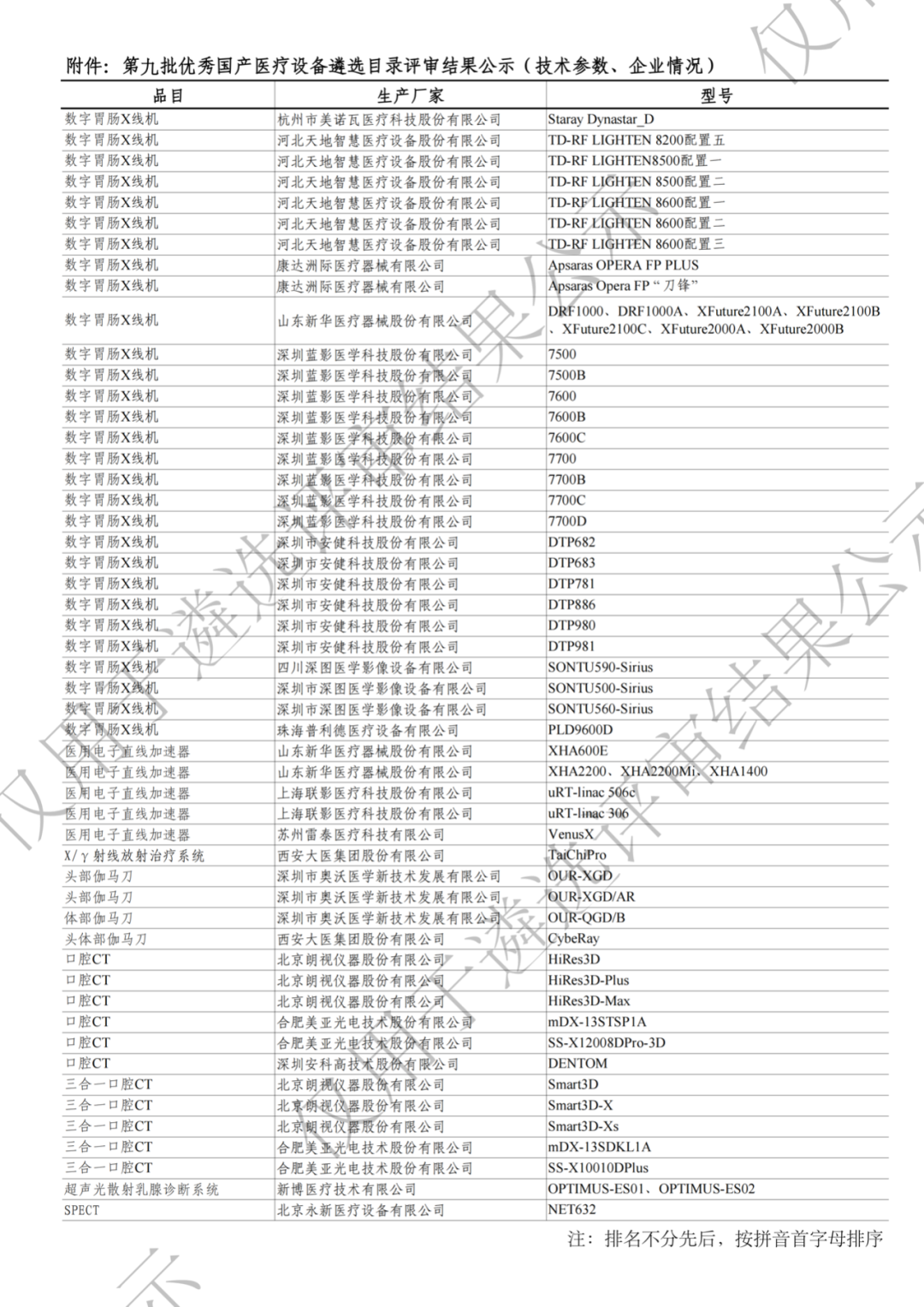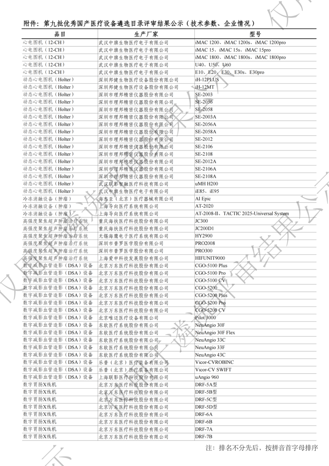 心电图机(12-CH)、动态心电图机(Holter)、医用电子直线加速器、γ-射线立体定向治疗系统、高强度聚焦超声肿瘤治疗系统、数字减影血管造影(DSA)设备、清洗消毒设备(压力蒸汽灭菌消毒、全自动清洗消毒、脉动真空清洗消毒、环氧乙烷灭菌、过氧化氢低温等离子灭菌、软式内镜清洗消毒、翻盖式全自动软式内镜清洗消毒、超声波清洗)、化学发光免疫分析仪(全自动、小型全自动、单人份、便携式4个子品目)、全自动酶联免疫分析仪(微板)、冷冻消融设备(肿瘤)、超声骨刀、SPECT、数字胃肠X线机、口腔CT设备、心肺复苏机、医用制氧机、超声光散射乳腺诊断系统、康复设备(定位牵引系统、振动排痰系统、吞咽神经和电刺激仪、空气波压力治疗仪、激光磁场理疗仪、脊柱定位减压系统)、眼底照相机、飞行时间质谱仪、实时荧光定量PCR仪(全自动、便携式)、全自动核酸提取仪、全自动血型分析仪。