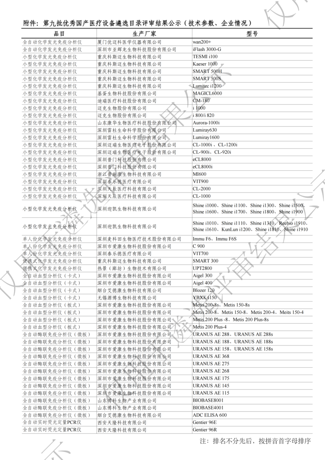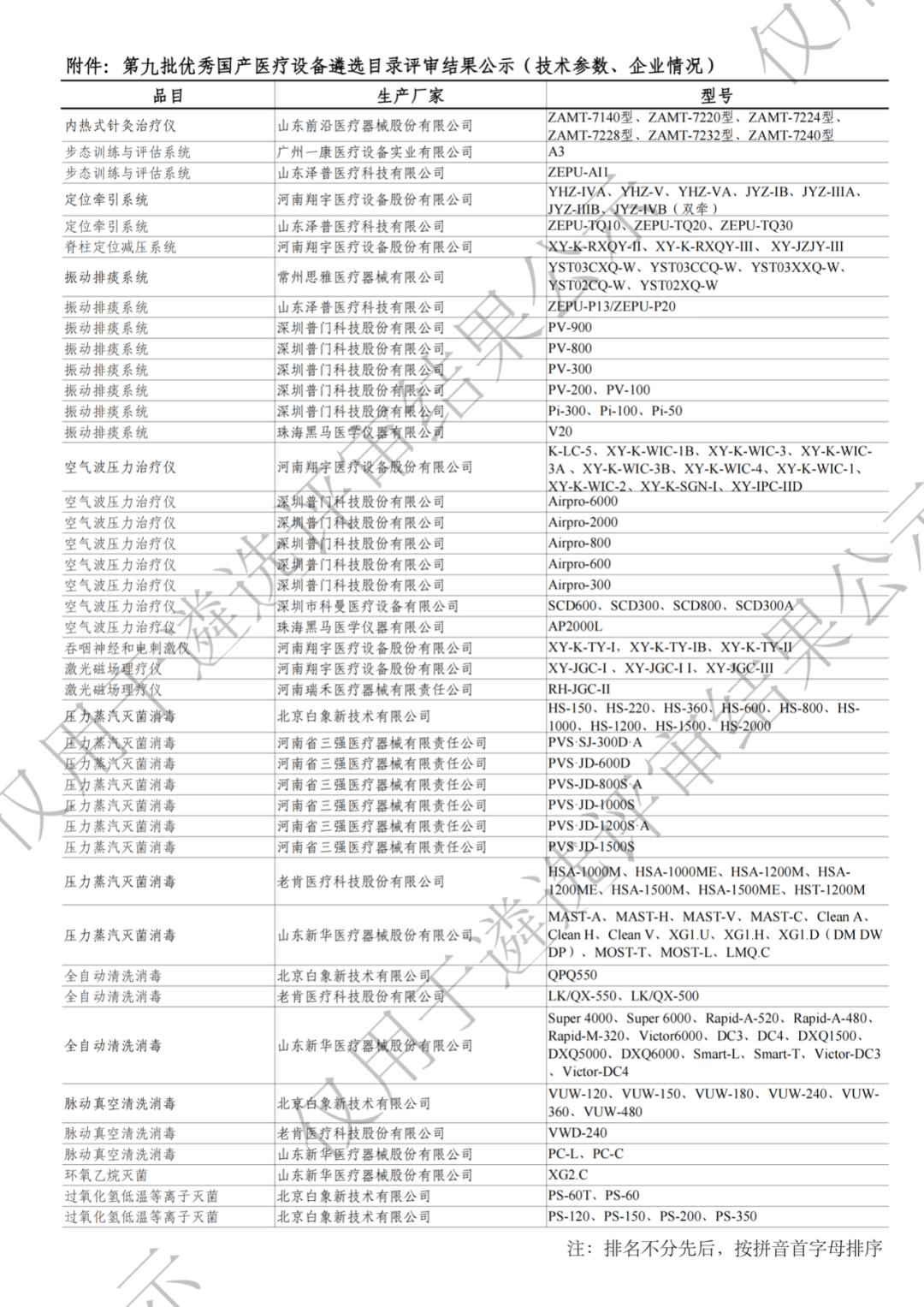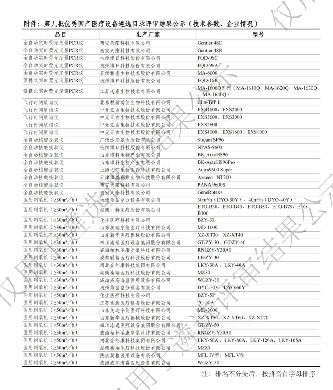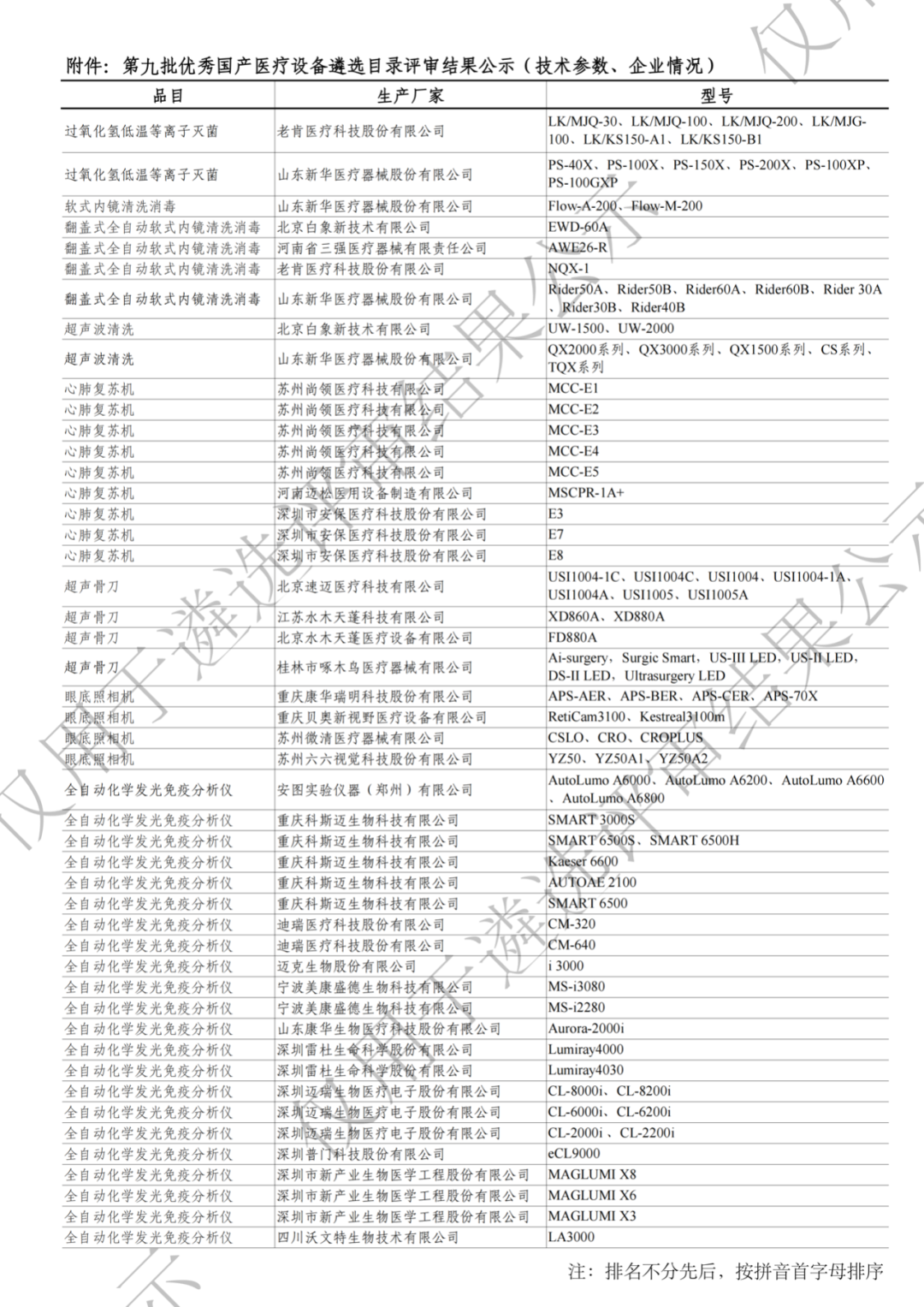 心电图机(12-CH)、动态心电图机(Holter)、医用电子直线加速器、γ-射线立体定向治疗系统、高强度聚焦超声肿瘤治疗系统、数字减影血管造影(DSA)设备、清洗消毒设备(压力蒸汽灭菌消毒、全自动清洗消毒、脉动真空清洗消毒、环氧乙烷灭菌、过氧化氢低温等离子灭菌、软式内镜清洗消毒、翻盖式全自动软式内镜清洗消毒、超声波清洗)、化学发光免疫分析仪(全自动、小型全自动、单人份、便携式4个子品目)、全自动酶联免疫分析仪(微板)、冷冻消融设备(肿瘤)、超声骨刀、SPECT、数字胃肠X线机、口腔CT设备、心肺复苏机、医用制氧机、超声光散射乳腺诊断系统、康复设备(定位牵引系统、振动排痰系统、吞咽神经和电刺激仪、空气波压力治疗仪、激光磁场理疗仪、脊柱定位减压系统)、眼底照相机、飞行时间质谱仪、实时荧光定量PCR仪(全自动、便携式)、全自动核酸提取仪、全自动血型分析仪。