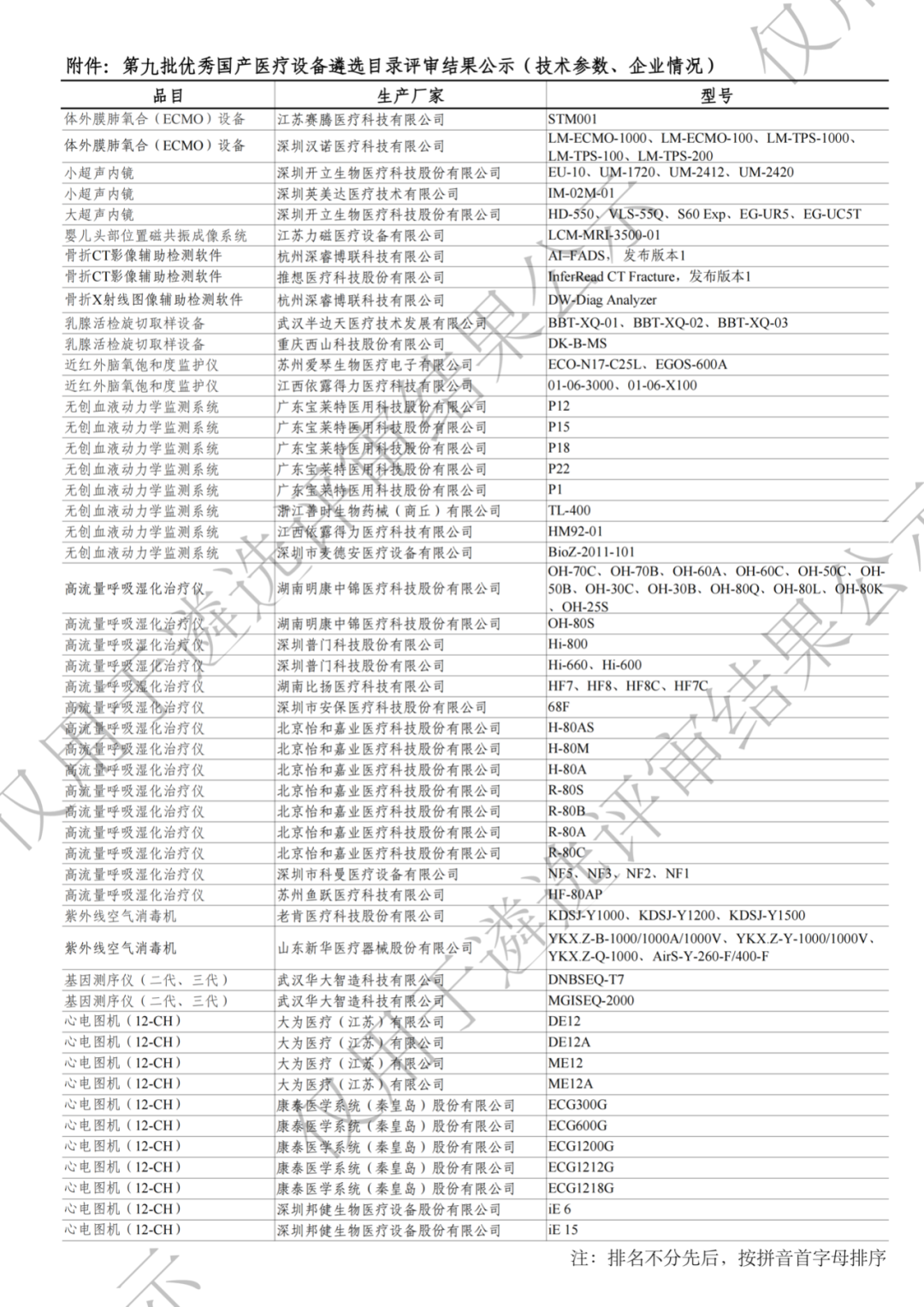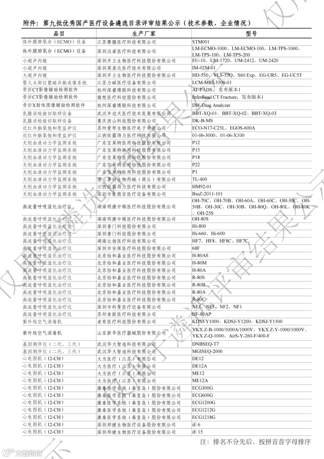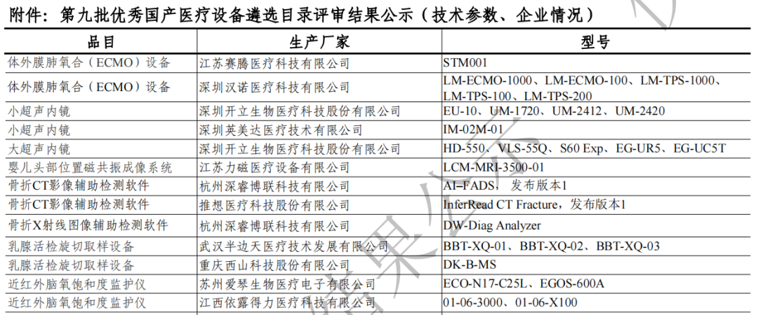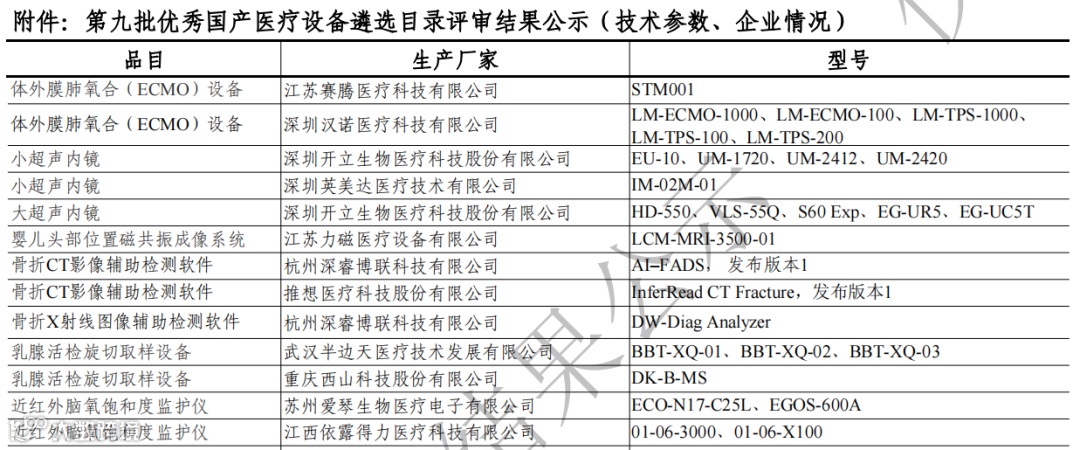 根据公布的评审结果,迈瑞、联影、东软、开立、宝莱特、理邦、乐普、万东等国内知名械企多款设备入选第九批优秀国产医疗设备产品目录。
