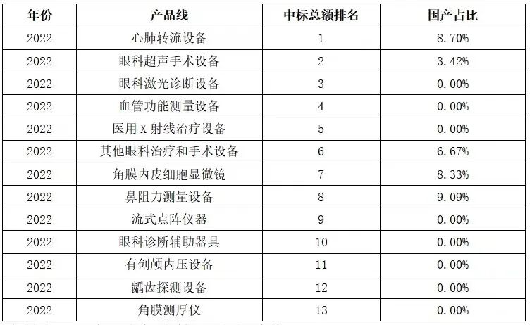 据众成数科统计,在2022年我国国产产品公开中标金额低于10%的产品共有13项,相比较去年减少了2个。从具体产品线来看,心肺流转设备中标金额位居首位,眼科超声手术设备和眼科激光诊断设备分居第二、三位。