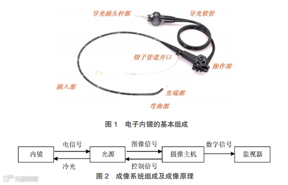 电子内镜一般由 5 个部分组成:先端弯曲部、插入部、操作部、导光软管及导光插头杆部(图1)。290 系列电子内镜工作原理是内镜与周边设备连接后,冷光源为内镜提供光源,由物镜成像于图像传感器的光敏面,图像传感器将光信号转换成电信号,电信号经光源传输至摄像主机,摄像主机将图像信号转换为抗干扰能力强的数字信号再传输给监视器。监视器将数字信号转化为高清晰度和高色彩还原度的影像。见图 2。