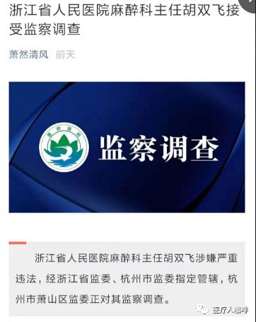 据萧山区纪委官方公众号“萧然清风”最新消息:浙江省人民医院麻醉科主任胡双飞涉嫌严重违法,经浙江省监委、杭州市监委指定管辖,杭州市萧山区监委正对其监察调查。