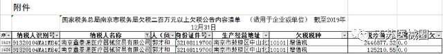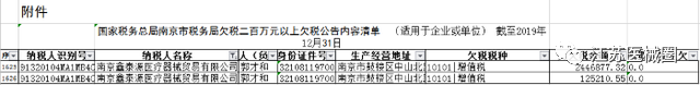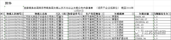 公告显示,南京鑫泰源医疗器械贸易有限公司被纳入“国家税务总局南京市税务局欠税二百万元以上欠税公告内容清单”里。