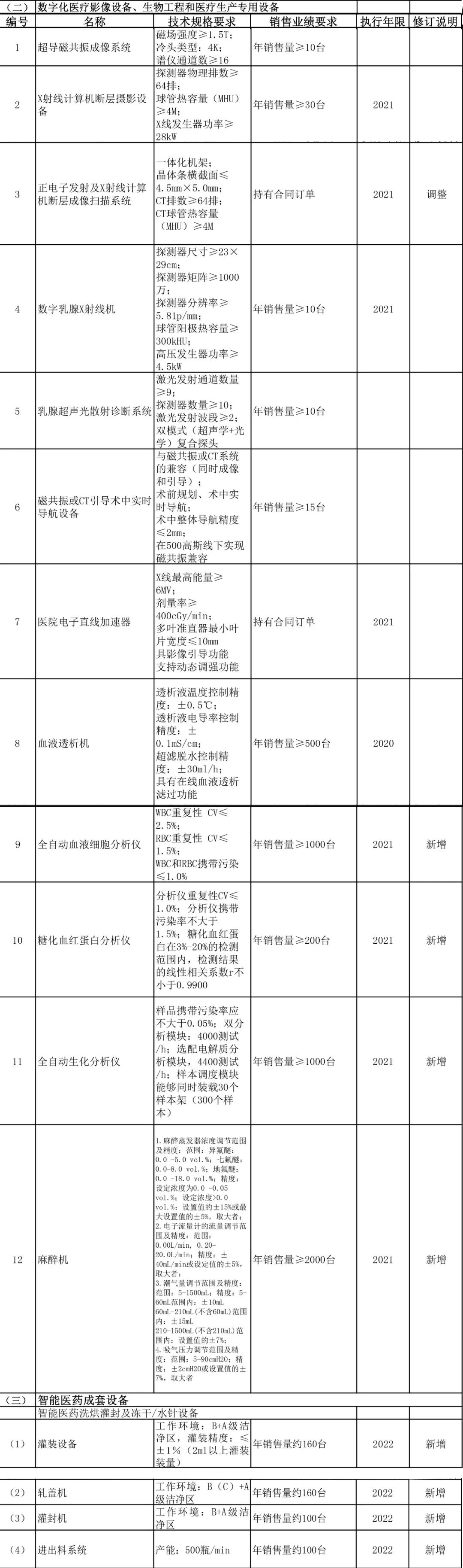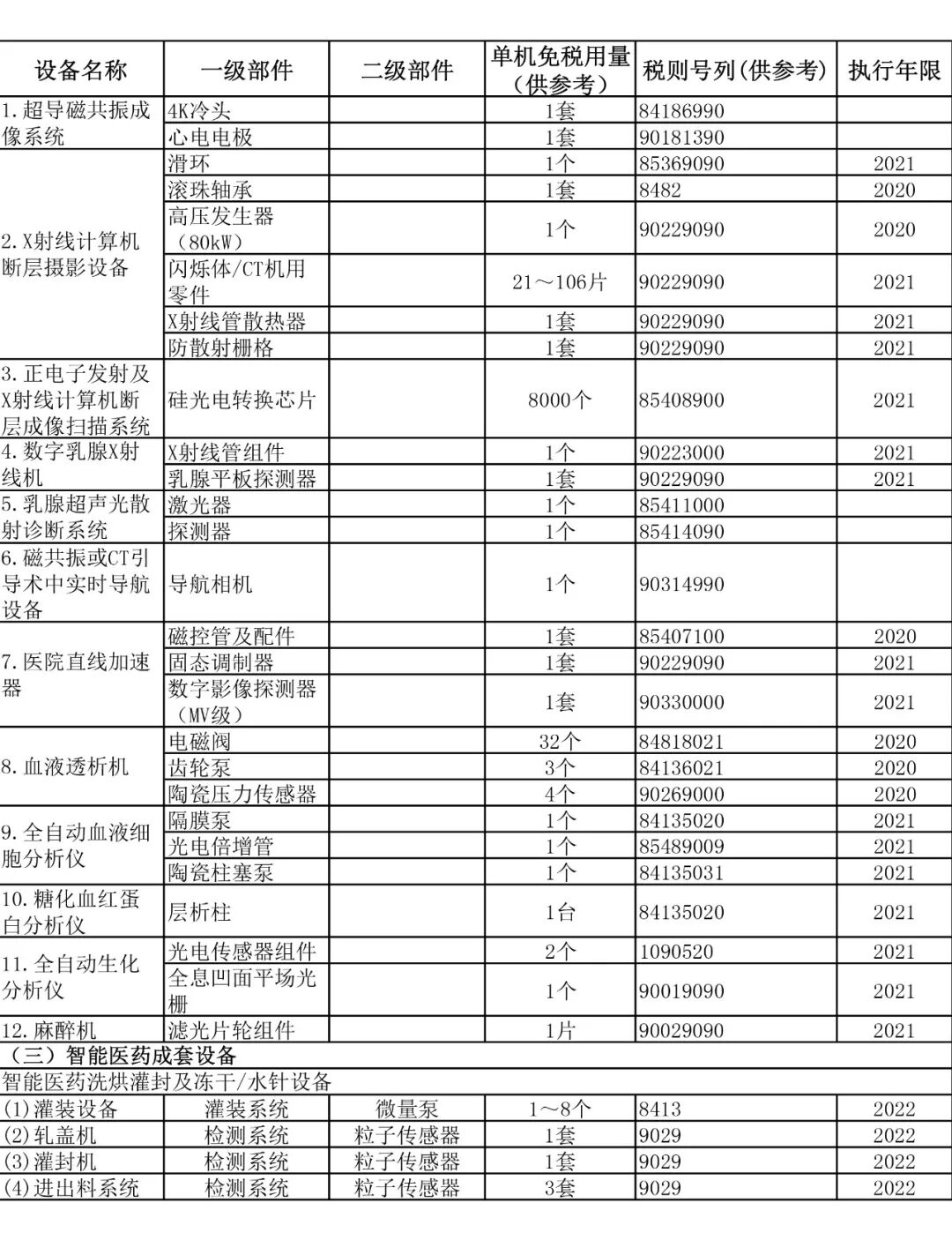 根据《国家支持发展的重大技术装备和产品目录(2019年修订)》和《重大技术装备和产品进口关键零部件、原材料商品目录(2019年修订)》,在“数字化医疗影像设备、生物工程和医疗生产专用设备”和“智能医药成套设备”类目中,包括1.5T及其以上超导磁共振系统、64排及其以上CT、PET-CT、数字乳腺X射线机、DR、磁共振或CT引导术中实时导航设备、6MV及其以上高能量医用直线加速器、以及血液透析机、全自动血液细胞分析仪、糖化血红蛋白分析仪、全自动生化分析仪、麻醉机、智能医药洗烘灌封及冻干/水针设备(包括灌装设备、轧盖机、灌封机、进出料系统)等医疗设备使用相关配件均在免征关税和进口环节增值税名单中(详见下文)。
