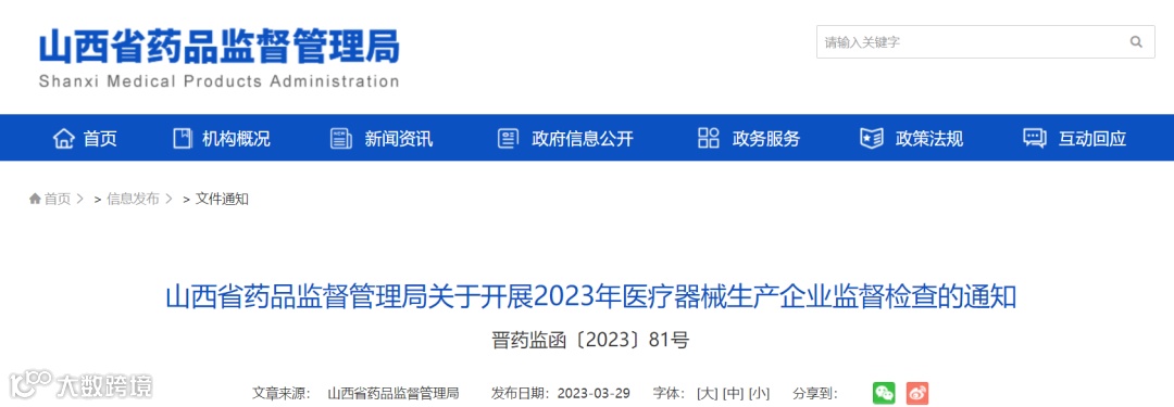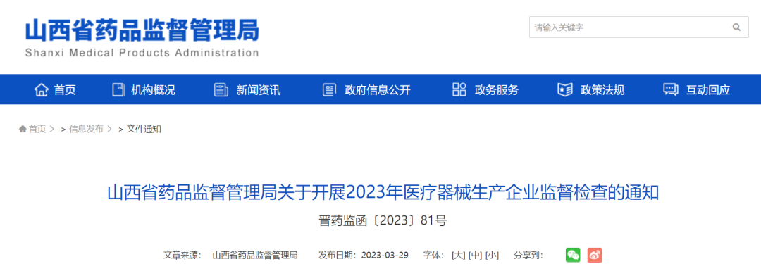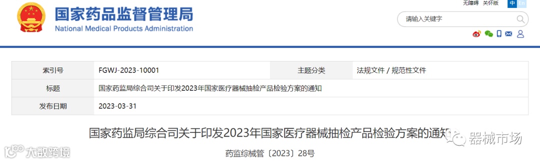 2023年3月31日,国家药监局发布《国家药监局综合司关于开展2023年国家医疗器械质量抽查检验工作的通知》(药监综械管〔2023〕5号),就国家医疗器械抽检品种检验、复检等工作提出有关要求。