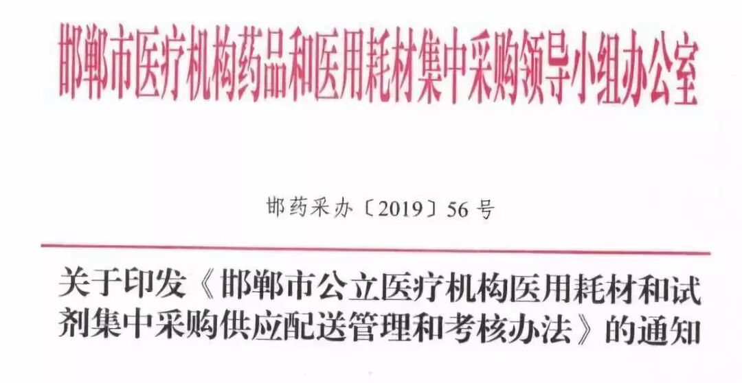 9月24日,邯郸市医疗机构药品和医用耗材集中采购领导小组印发了《邯郸市公立医疗机构医用耗材和试剂集中采购供应配送管理和考核办法》的通知(以下简称《通知》)。