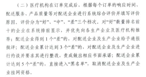 值得注意的是,配送企业得到1个“差”,将被给予通报批评;累计达到3个“差”将面临被约谈要求整改,并做出相应的书面承诺;一旦累计达到5个“差”,直接进入“黑名单”,取消配送企业及生产企业挂网资格。