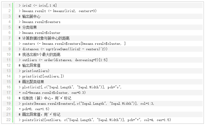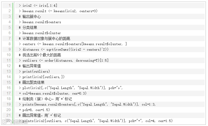 也可以使用K均值算法实现异常值的检测。首先通过把数据划分为k组,划分方式是选择距离各自簇中心最近的点为一组;然后计算每个对象和对应的簇中心的距离(或者相似度),并挑出拥有最大的距离的点作为异常值。
