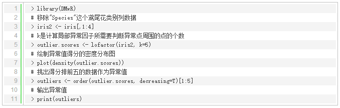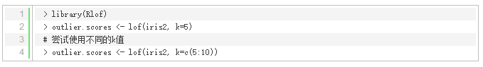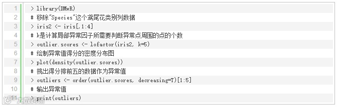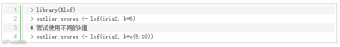 使用包‘DMwR’和包‘dprep’中的lofactor()可以计算LOF算法中的局部异常因子。
