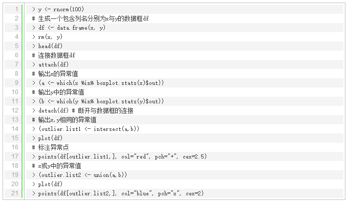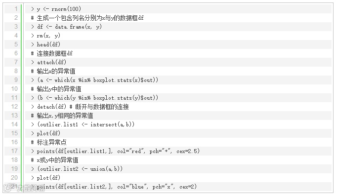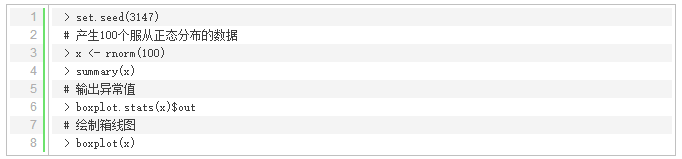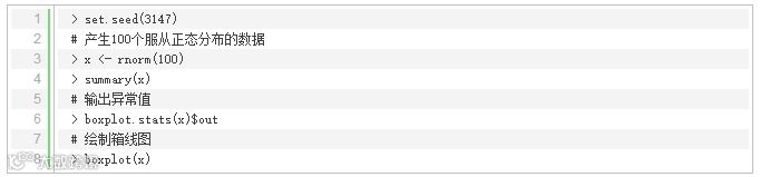 这一节主要讲单变量异常值检测,并演示如何将它应用到多元(多个自变量)数据中。使用函数boxplot.stats()实现单变量检测,该函数根据返回的统计数据生成箱线图。在上述函数的返回结果中,有一个参数out,它是由异常值组成的列表。更明确的说就是里面列出了箱线图中箱须线外面的数据点。其中参数coef可以控制箱须线从箱线盒上延伸出来的长度,关于该函数的更多细节可以通过输入‘?boxplot.ststs’查看。
