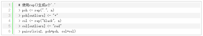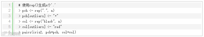 我们也可以通过pairs()函数绘制散点图矩阵来显示异常值,其中异常值用红色的'+'标注: