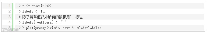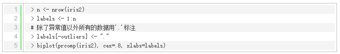接下来对鸢尾花数据进行主成分分析,并利用产生的前两个主成分绘制成双标图来显示异常值。