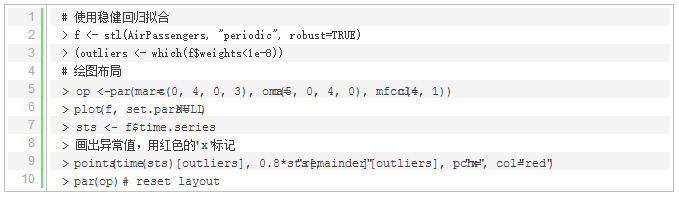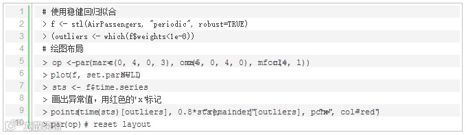 本节介绍如何从时间序列数据中检测出异常值。首先使用函数stl()对时间序列数据进行稳健回归方法分解,然后识别出异常值。实现代码如下: