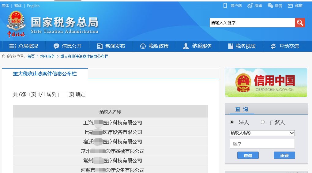 近日,国家税务总局公布了2019年7月重大税收违法案件信息公布栏。据不完全统计,共有6家医疗器械企业被通报。