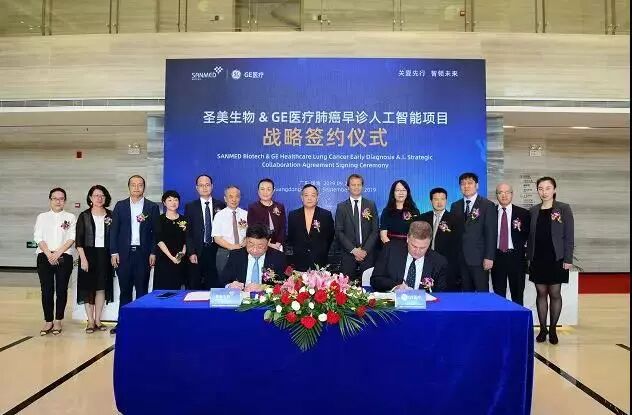 近日,圣美生物与GE医疗在珠海共同签署了“圣美生物 & GE医疗肺癌早诊人工智能项目战略合作协议”,并举行了盛大的战略签约仪式。由圣美生物总经理石剑峰先生和GE医疗细胞分析业务全球总经理 Michael Lewis先生共同落笔成就了这一重要时刻。利用圣美生物全球领先的肺癌早诊液态活检技术和GE医疗领先业界的人工智能技术的双方优势结合,双方将合作构建智能影像分析与诊断系统,提升肺癌的早期诊断精准度,促进精准医疗发展。