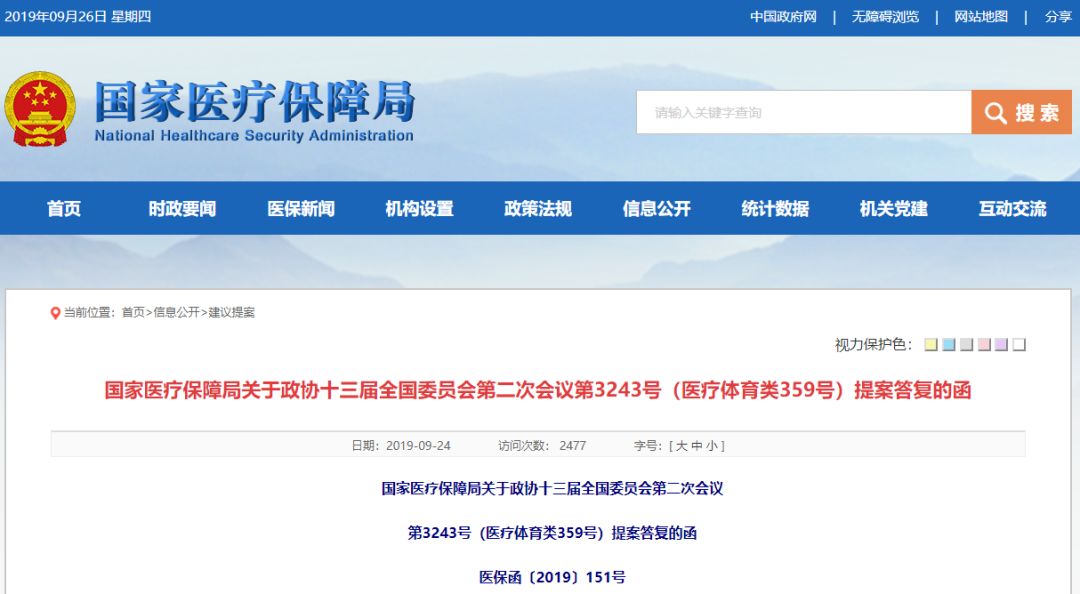 9月24日,国家医疗保障局公布了《关于政协十三届全国委员会第二次会议(医疗体育类359号)提交答复的函》(以下简称《答复》)。