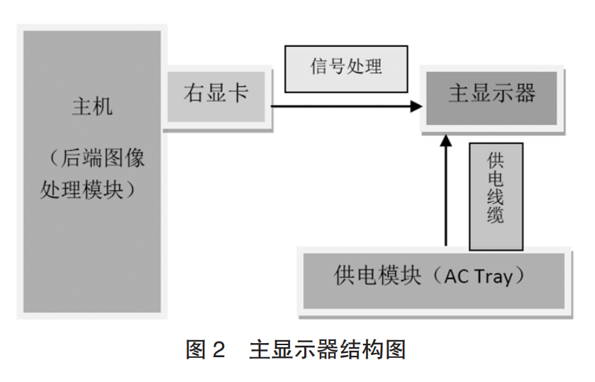 根据设备工作原理考虑,引起该故障的原因可能有:主显示器、主显示器到输入输出板的线缆、输入输出板、供电模块、供电线缆。从无背光这一故障现象来看,需重点考虑主显示器自身问题、供电模块或者供电线缆问题。如图 2 所示。