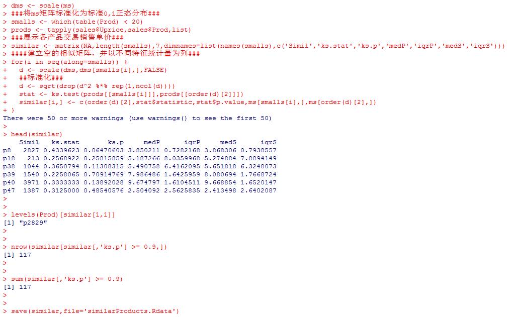 左图受各别值影响,右图进行了对数处理,数据显示如下:许多少数产品的中位数和IQR和其他产品非常相似。然而也有几种产品不仅交易少,而且价格分布也有较大差异。为了更有效的比较分布我们使用K-S检验分布是否来自相同分布,显著性水平定义为10%。--推断统计应用,检验分布统计意义上的相似性。--计算过程如下: