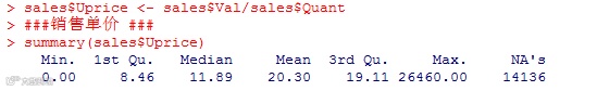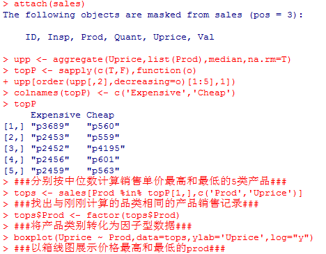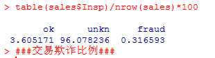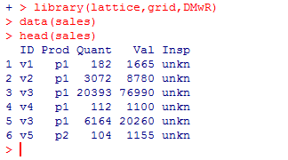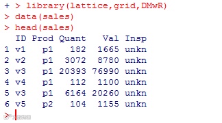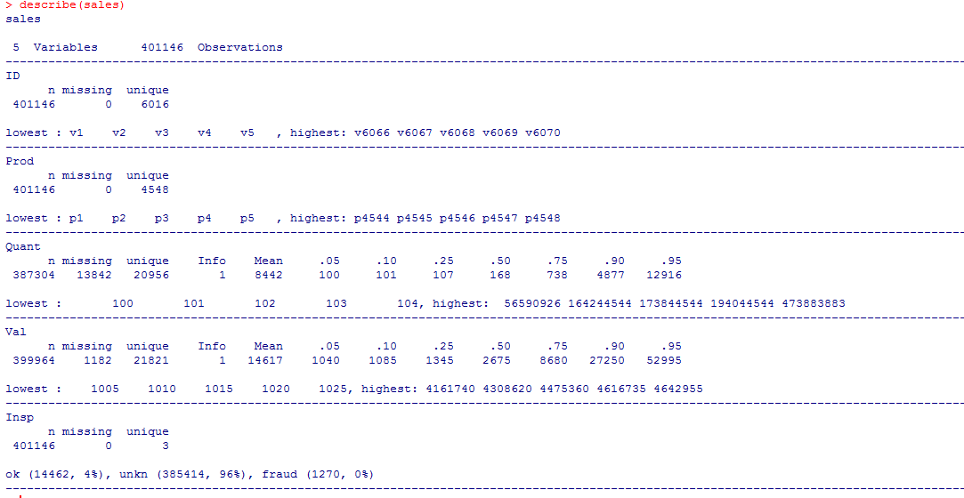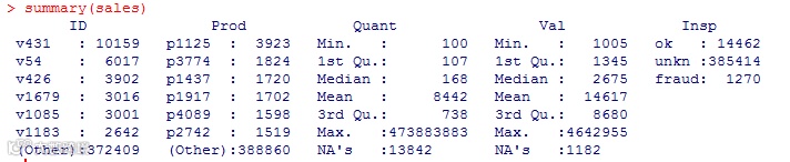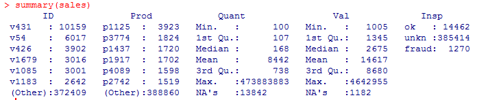 ID:说明销售员ID的一个因子变量;Prod:说明销售产品ID号的一个因子变量;Quant:报告该产品销售的数量;Val:报告销售记录的总价值;Insp:有三个可能值的因子变量——ok表示公司检查了该交易并认为该交易有效;fraud表示发现该交易为欺诈;unkn表示该交易未经过公司审核。