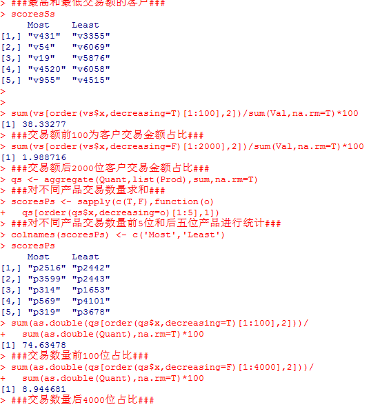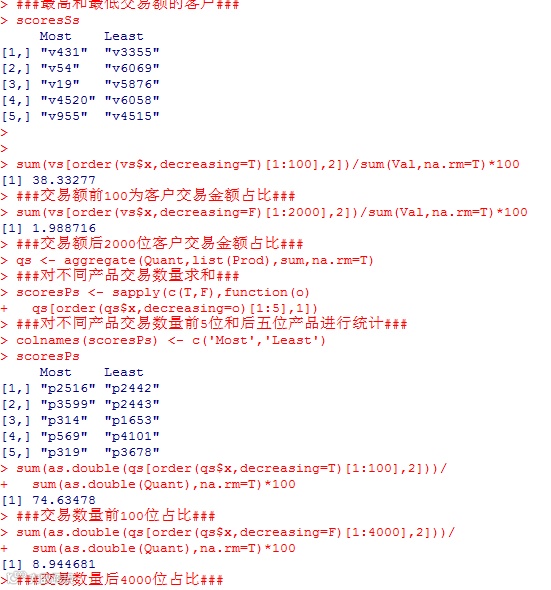 以上数据结果说明:销售金额前100(不到2%)的销售人员销售收入占比超过40%,而近三分之一的销售人员只贡献了约2%;而产品方面差异更为显著,后90%的产品仅贡献了少于10%的销量。这个信息对生产十分有用,但并不意味着公司应该停止该产品生产,因为我们没有生产成本的信息,这些产品有边际利润存在的可能,同时也不是本案例的目的。