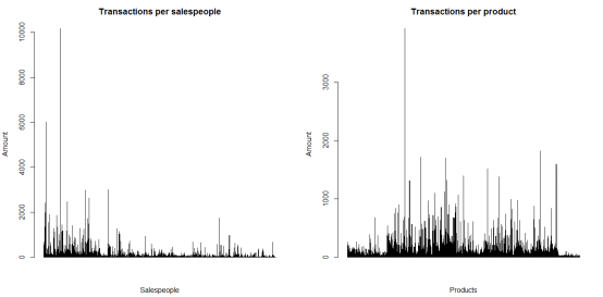 下图各销售人员交易量波动性很强且不同产品可能有较大差异,但我们还没有考虑产品数量的影响。