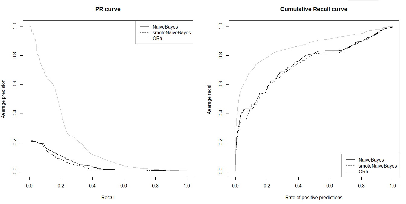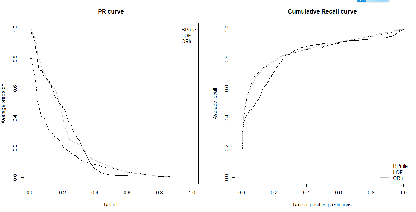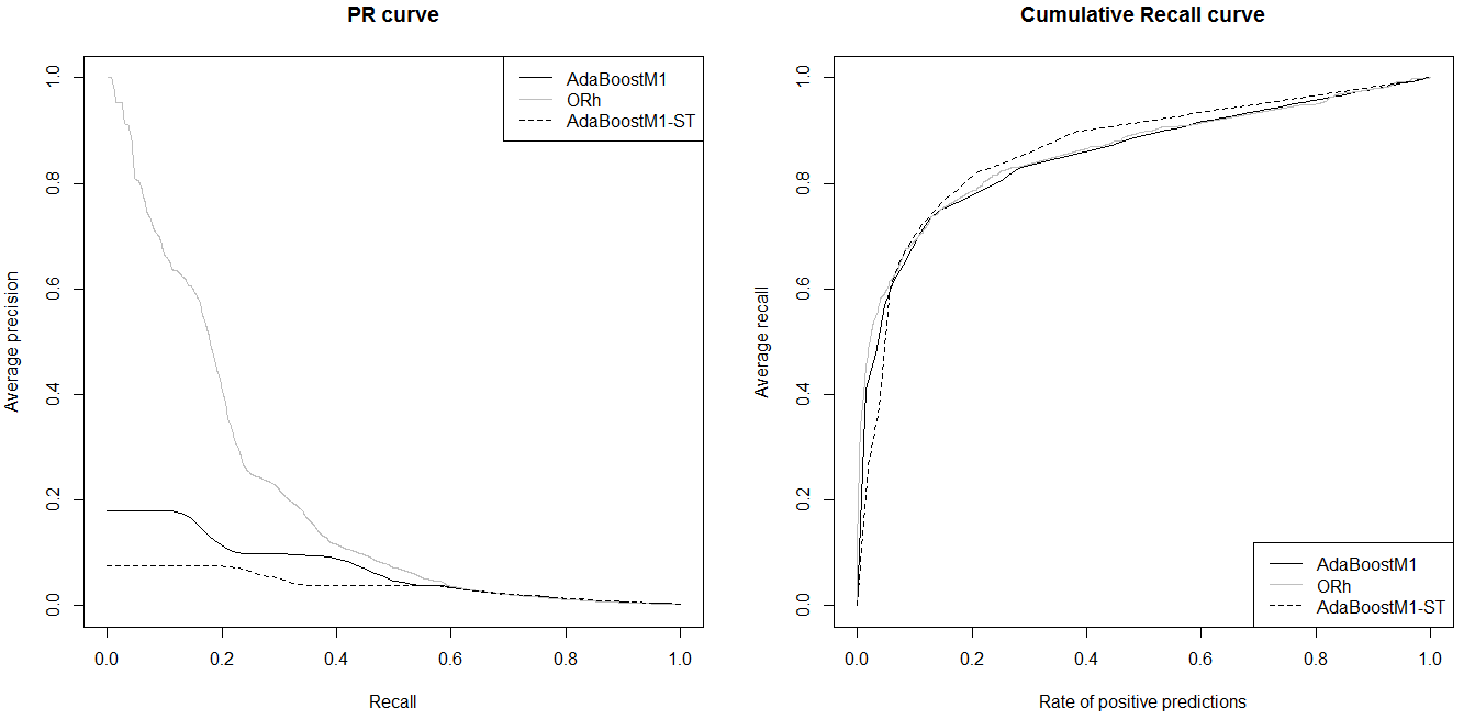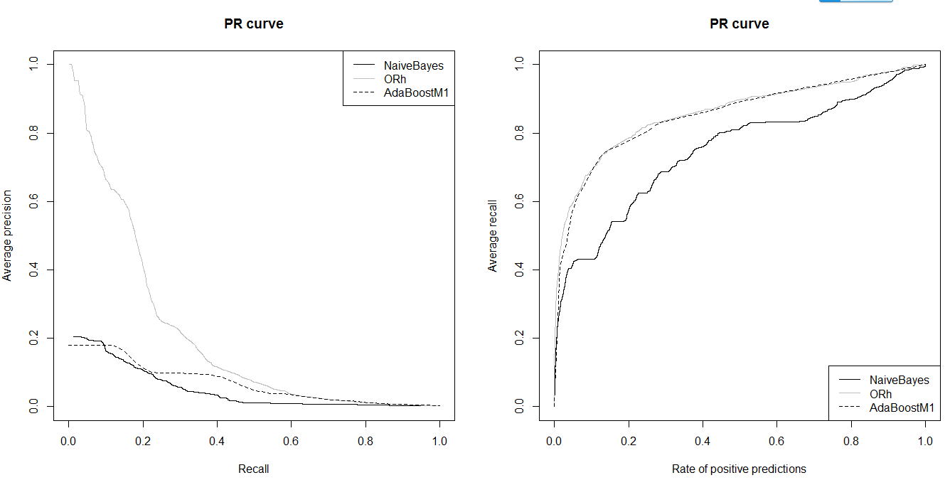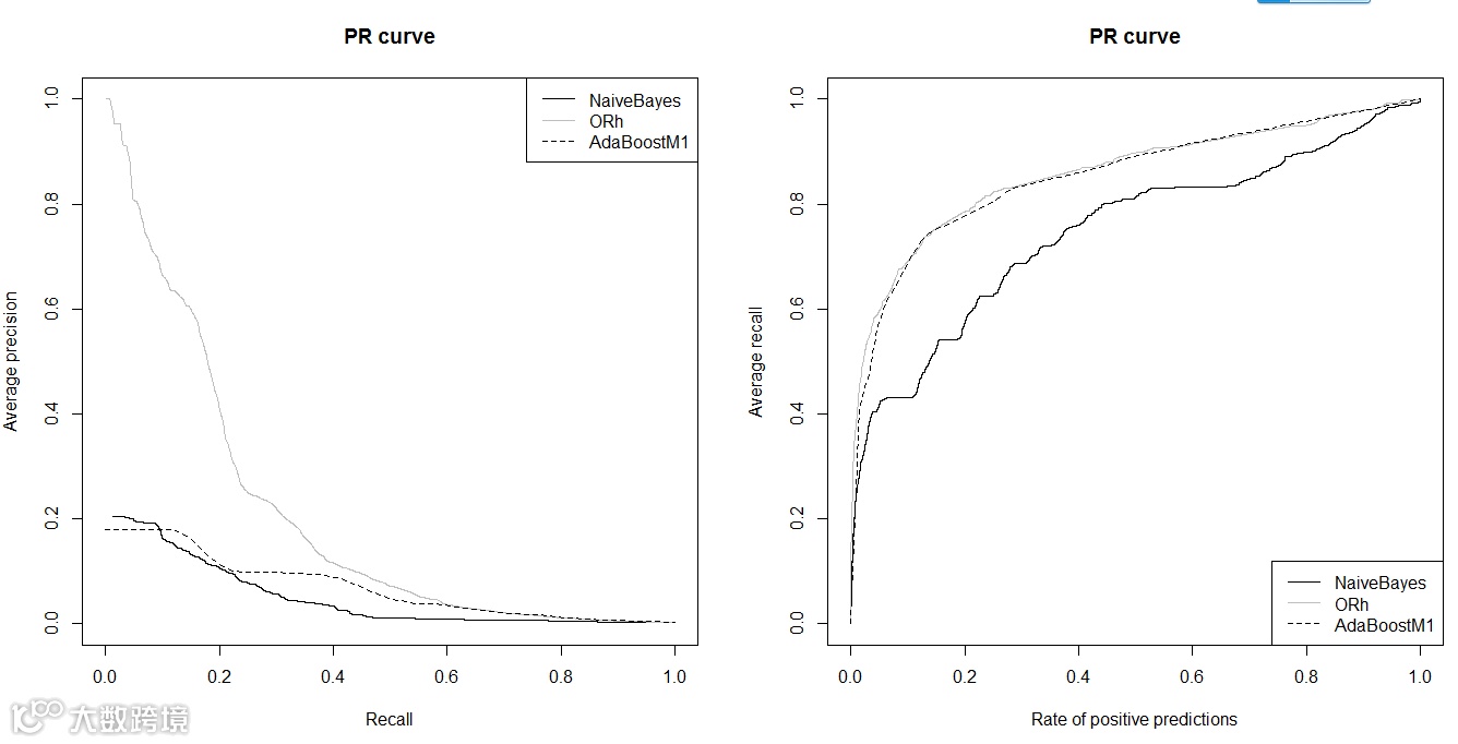 PR曲线而言,对低水平的召回值,精确度明细低于ORh方法,但对本案,累计召回度,与ORh效果接近,说明Adaboost在对类失衡问题下仍有较好的性能。