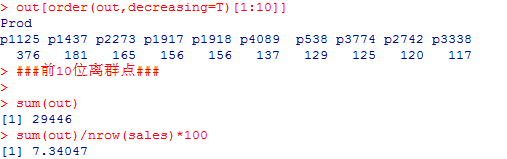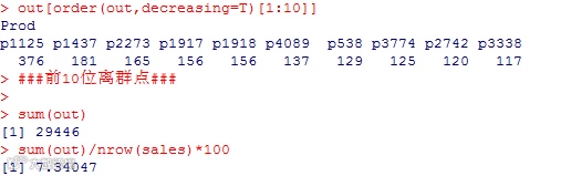 基于聚类的离群值排名:---分层聚类。---聚类树思想,将这些树在不同高度水平进行切割时给出数据的不同聚类,这个方法的类是不断合并而成的。离群值分数来自于合并前类的大小与合并后类大小的差,如果合并后与合并前的明细,则离群值分高。建模结果如下:
