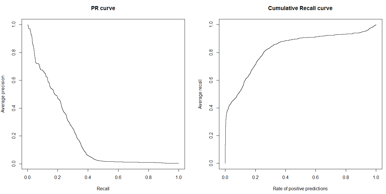 同时如果算法没有显著提升的情况下,精确度与召回率之间是需要权衡的。因为一般二者是负相关的,给定用于检验行为的资源约束条件,我们真正想要的是最大限度的利用资源。这意味着我们可以用x小时检查报告,并能够在这x小时捕捉到所有欺诈行为,及时有一定的正常交易我们也不care,因为目的达到了,即我们需要的是使用现有资源达到100%的召回率。而精确度与召回率趋势是模型性能的可视化表现。通过不同的工作点得到上面统计量的插值,得到该曲线。这些工作点由模型感兴趣的类别排序中断点给出。在我们案例中,这将对于应用在模型所产生的离群值排序上的不同资源限制。对不同的限制水平(即检验更少或更多的样本)进行迭代,得到不同的决策精确度和召回率。--PR图。