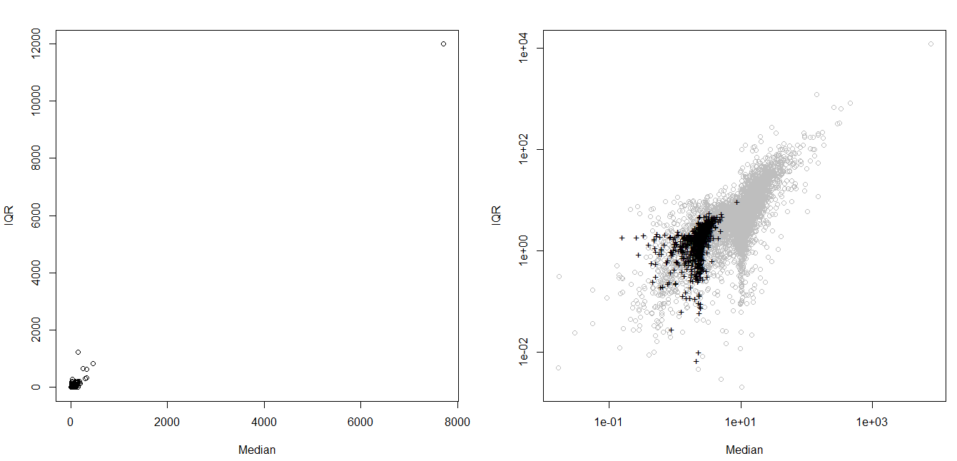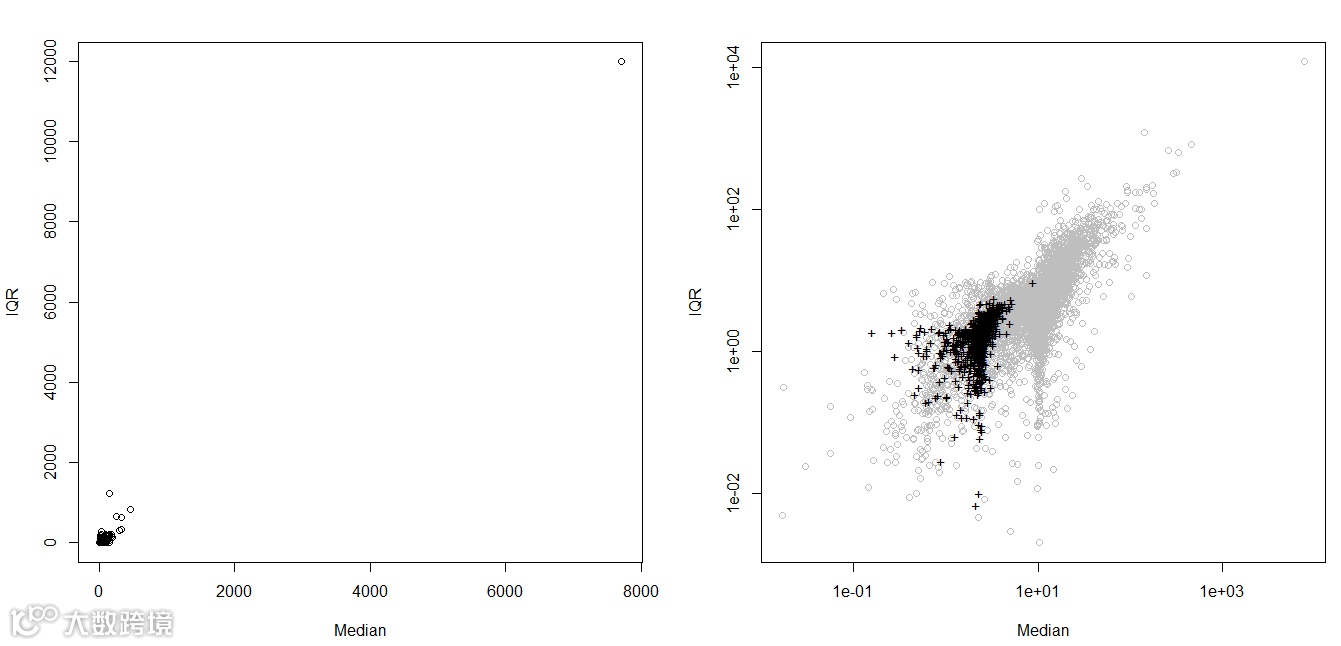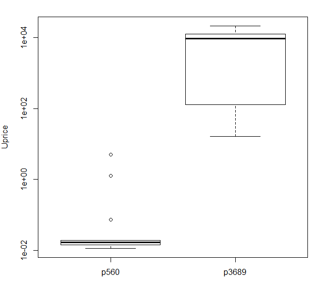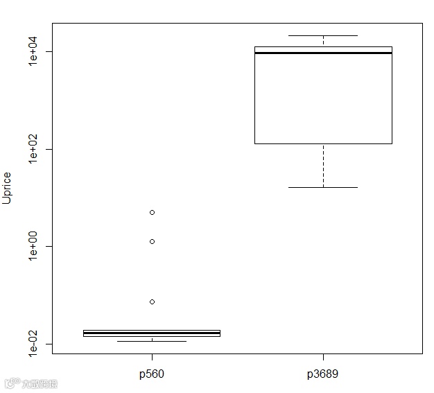 思路:归入其他产品类。具体为:尝试观测产品单价分布的相似性来推断其中的一些关系。如果发现有类似价格的产品考虑合并相应交易进行分析,从而寻找异常值。前文讲到交易样本小于20的产品共982种。而比较分布的方法有数据可视化和统计检验,鉴于产品种类多,采用统计检验方法,考察数据分布的统计特性(集中趋势和离散程度)离散程度使用中位数、离散程度采用四分位差。采用这两个指标的原因在于中位数和四分位差较于均值和标准差而言受异常值影响小(大家可以思考为什么??),指标更稳健。首先进行可视化观测假设。