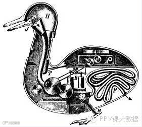 据维基百科资料,1738年,法国技师杰克·戴·瓦克逊发明了一只机器鸭,它会嘎嘎叫,会游泳和喝水,还会进食和排泄。这只机器鸭主要被用于医学研究。