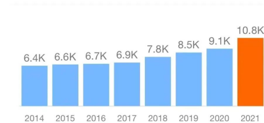 从上图中可以看出2021年工资为¥10.8k,较2020年增长了19%;2020年工资为¥9.1k,较2019年增长9%;2019年工资为¥8.5k,较2018年增长了9%;2018年工资为¥7.8k,较2017年增长了13%。