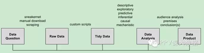 现在,我们说一说数据科学吧。数据科学是一个新的术语,因此也有更多错误的定义。我对数据科学的定义是源自约翰霍普金斯大学的数据科学学院的。数据科学是一个对数据进行获取、转化、分析以及得出结果的过程。如果你是一个渴望知道其线性过程的人,其中可以看以下下面的内容: