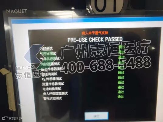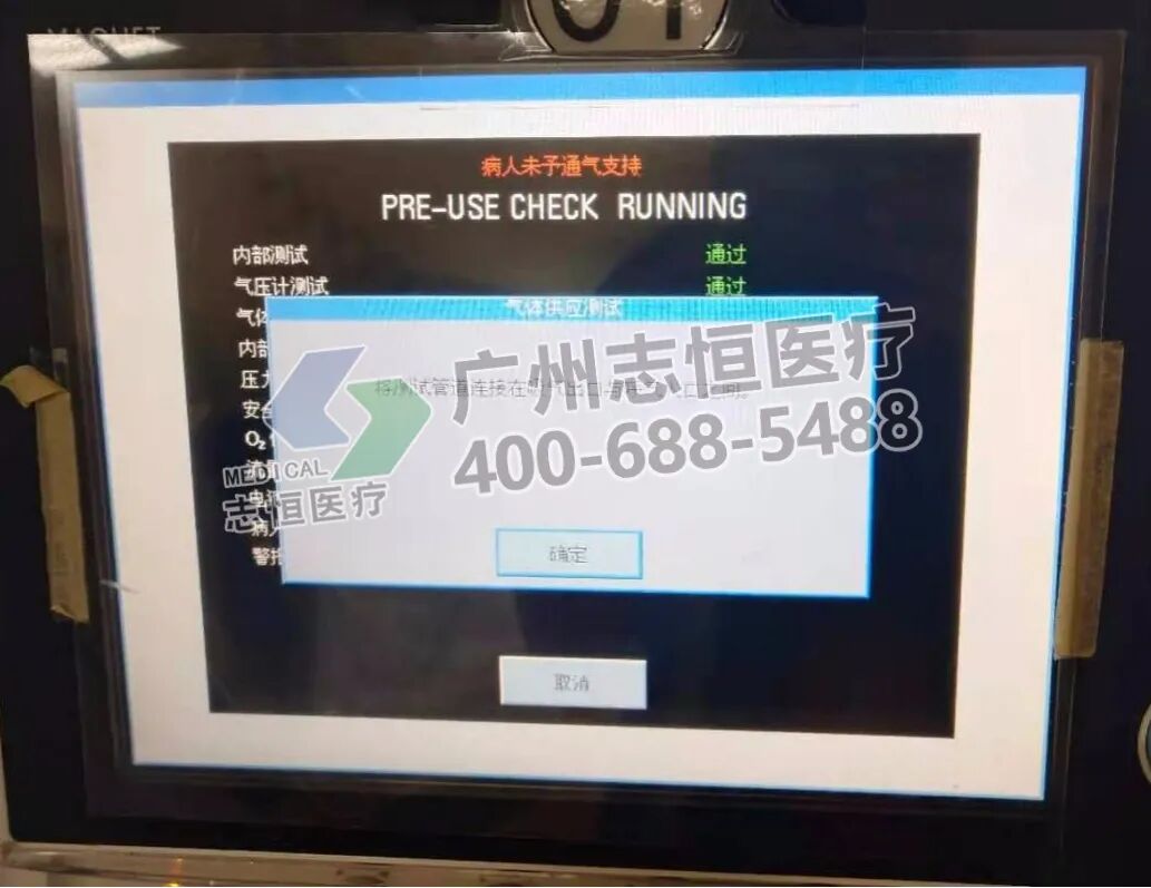 9、机器自检,前面几项检查自动开始、通过后自动进行下一项。到出现下面的提示时,将呼吸机管路中的短管两端分别加入呼吸机的吸入端和呼出端并点击“确定”。机器自检继续。