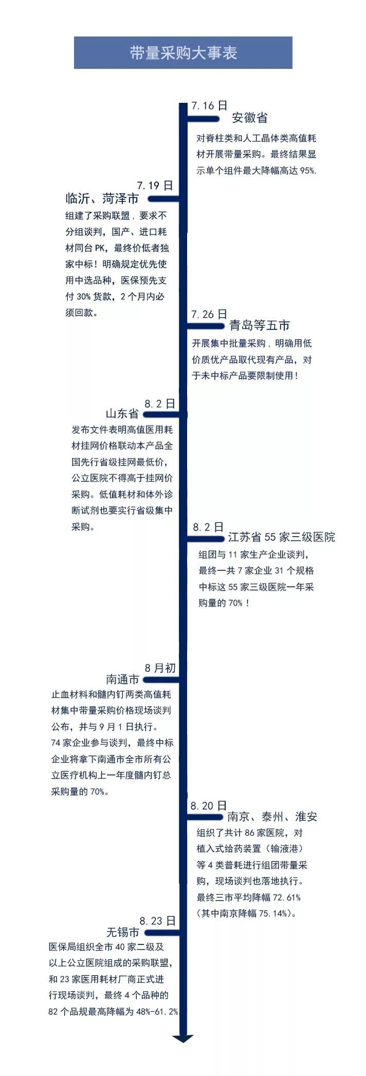 全国范围内,从7月开始,江苏、安徽、山东等三省,省市级医用耗材带量采购频频落地,中标企业动辄拿下超出全省市公立医院50%的采购量,最终降价幅度也几度突破90%!