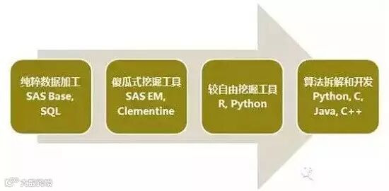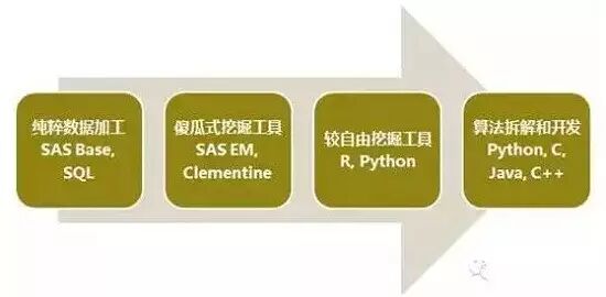 在银行领域,基本上,只能看到第一种角色。数据基本上来源于仓库系统,然后运用SQL、SAS、R,提取、加工、建模和分析。