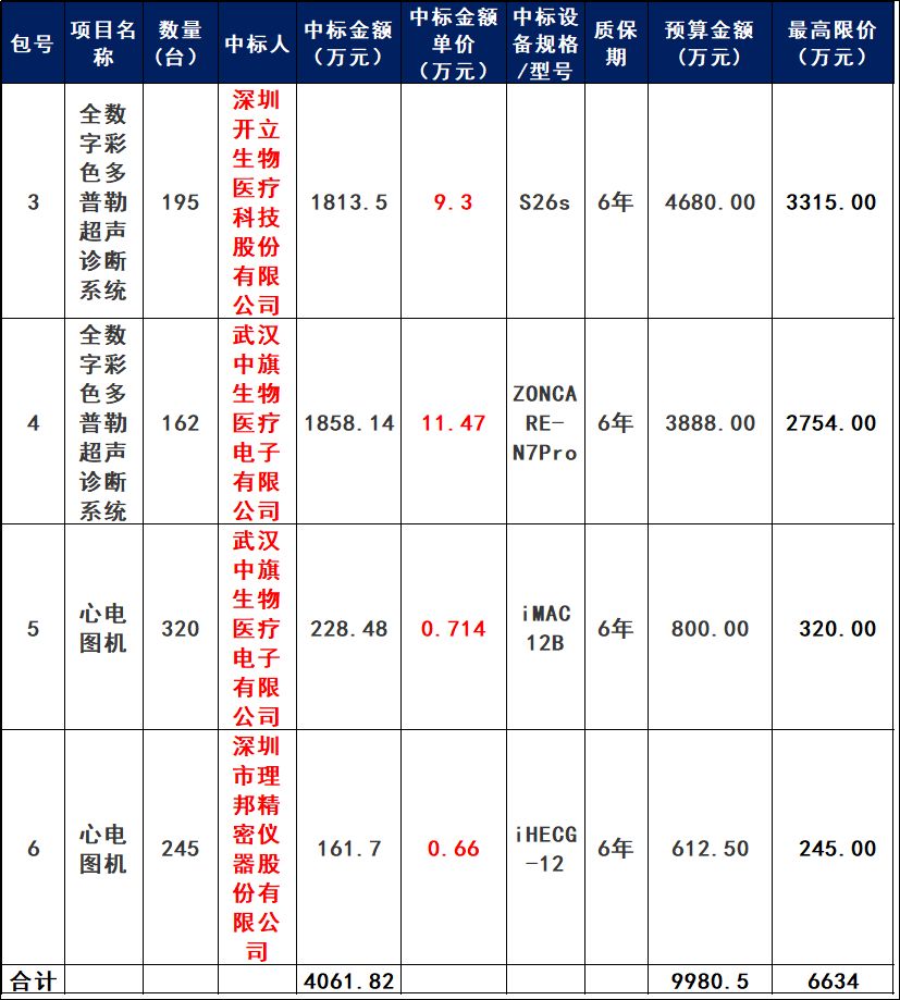 本次公布的是第3-6个包的中标结果,涉及357台彩超、565台心电图机,总预算金额9980.5万元,最高限价仅6634万元。也就是说单台彩超的最高限价是17万元,单台心电图机的最高限价是1万元。