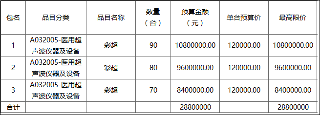 湖南省卫健委也发布了2019年省级补助基层医疗卫生机构设备(彩超)项目。该项目分3个包,共计采购240台彩超,预算金额2880万元,单台预算价和最高限价均是12万。