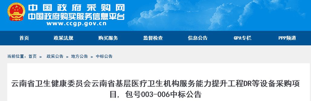 7月5日,中国政府采购网发布《云南省卫生健康委员会云南省基层医疗卫生机构服务能力提升工程DR等设备采购项目,包号003-006中标公告》。