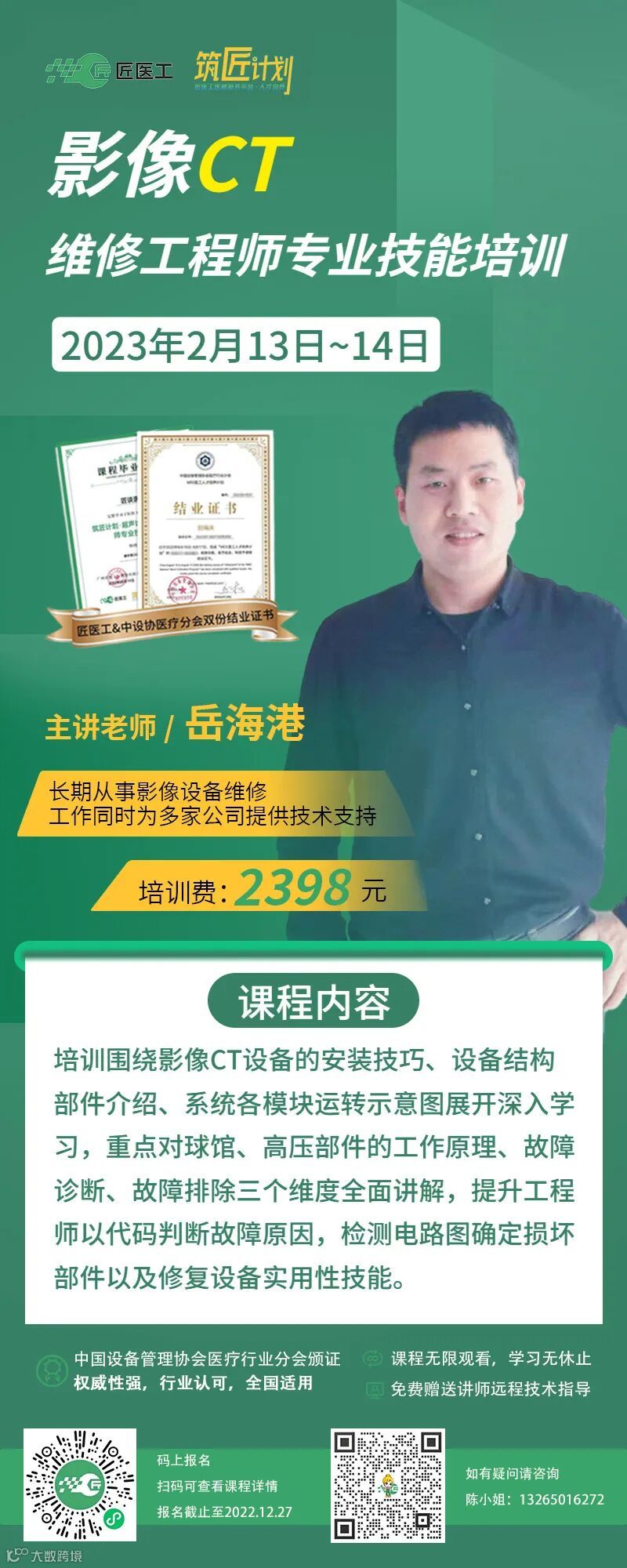 2月13-14日,匠医工推出影像(CT)维修工程师专业技能培训课程,助力各位影像同行系统学习CT维修技术,提升自我能力,“称霸”职场~