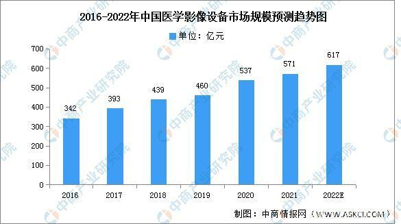 我国医学影像行业虽然起步较晚,但增速较快。据中商产业研究院数据显示,中国医学影像设备市场规模由2016年的342亿元增长至2020年的537亿元,年均复合增长率为11.9%。中商产业研究院预测,2022年我国医学影像设备行业市场规模将达617亿元。