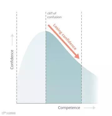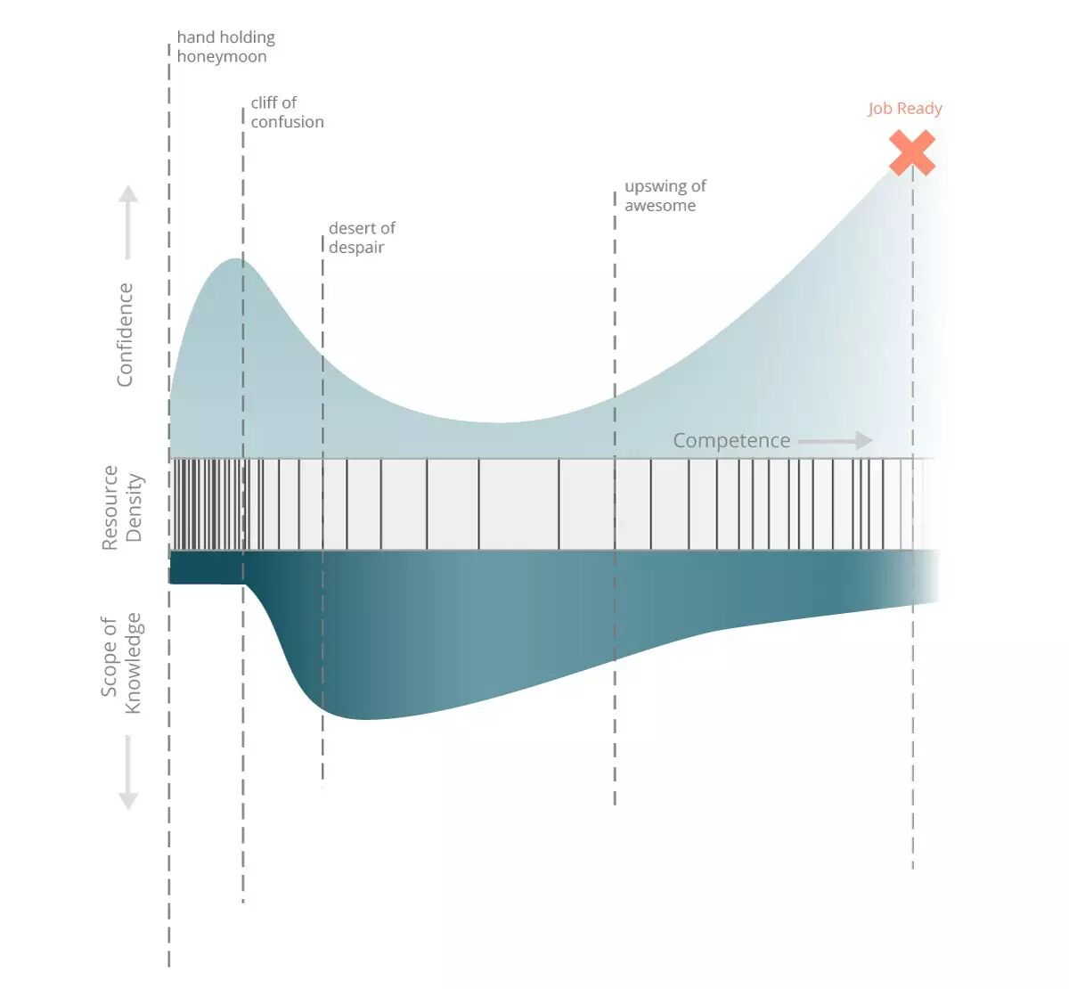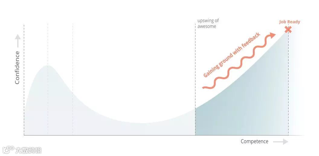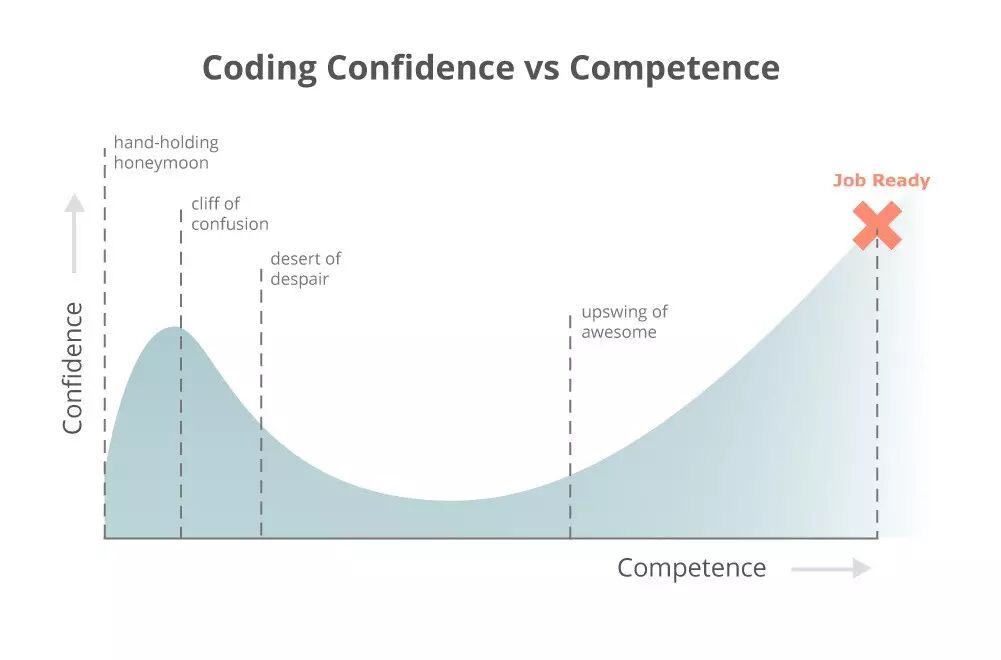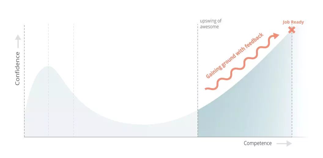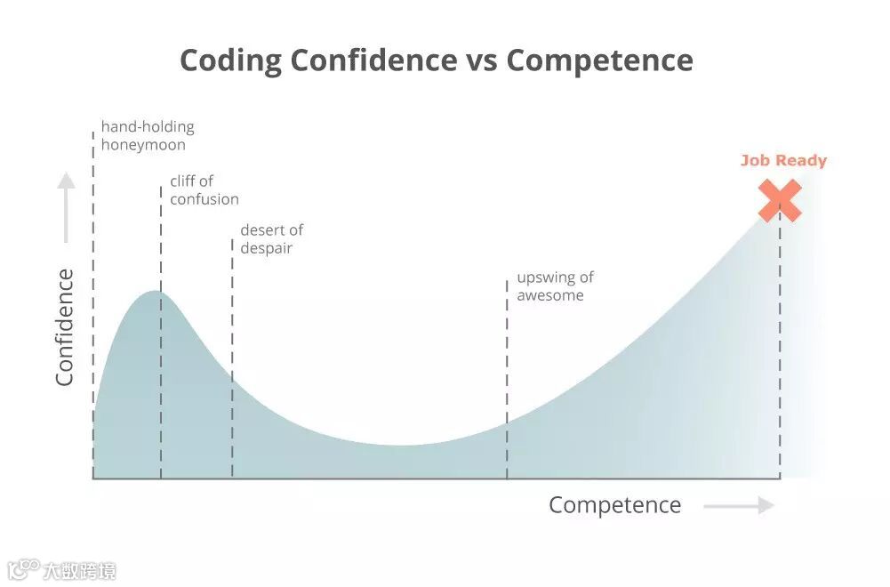 旅程艰辛就为了达到找工作的水平,这个艰苦的过程可以描绘成你的自信心随能力增长的变化曲线。