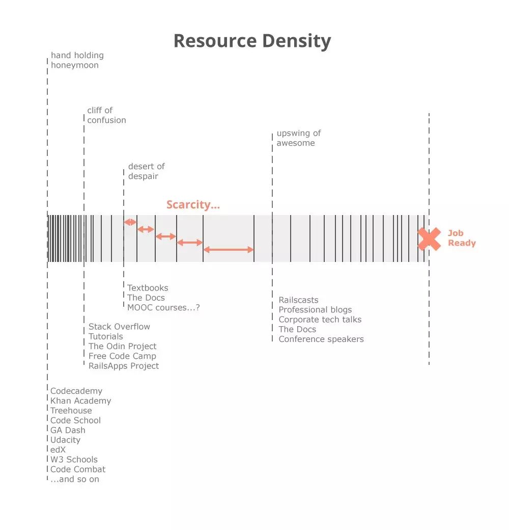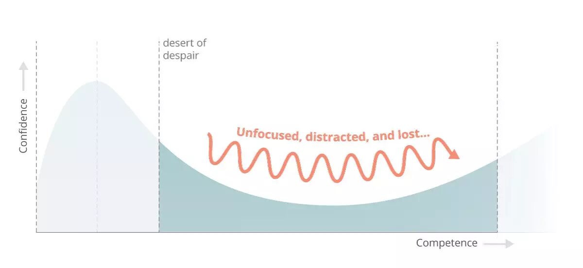 理解了上面两个因素后,你会发现阶段二仅仅是个转折点。快速提升的知识面广度和急剧下降的资源密集度让你在这个阶段倍感痛,因此我称它为“绝望的沙漠”(身处这个阶段犹如在沙漠中一样,迷茫得团团转却找不到方向)。
