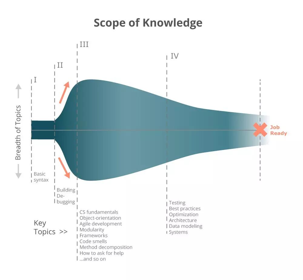 刚开始学编程时,你需要理解的东西很少。不论你的目标是什么,不论你用什么编程语言,也不论你之前是做什么的,每个人要做的都是搞清楚什么是for循环,如何创建条件语句,以及其他一些编程语法的基础结构。总体来看也没多少基础概念,因此阶段一所需要的知识面广度很窄。一旦你学完了基础部分,就需要去了解一些更复杂的东西,比如理解错误以及何时使用那些你已经会用的代码,此时你会发现需要学习的额外知识瞬间多了很多。这个时候情况变得不同了,因为一个明确的问题不一定有一个绝对正确的答案……事情开始变得棘手。