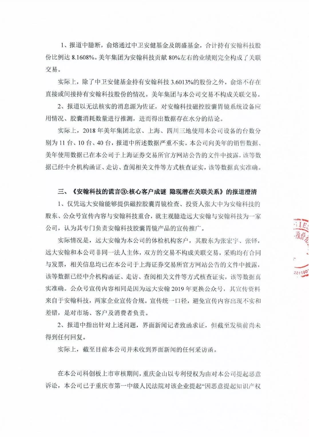 重庆金山工作人员表示,被侵犯的专利权主要与胶囊内窥镜有关,除对专利权提起民事诉讼外,他们还就安翰科技公司涉嫌虚假宣传的情况,以书面材料形式向上海证券交易所进行举报。