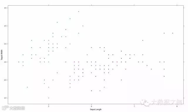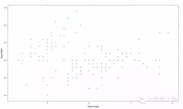 >xyplot(Sepal.Width ~ Sepal.Length, iris, groups = iris$Species, pch= 20)