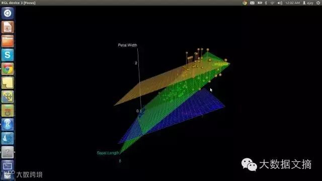 >scatter3d(Petal.Width~Petal.Length+Sepal.Length|Species, data=iris, fit="linear"